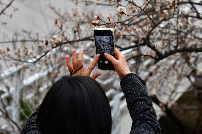 | ▲3일 오전 경북 포항시청사 화단에서 출근길에 나선 한 시민이 휴대폰으로 매화꽃을 촬영하고 있다./사진=뉴스1 |