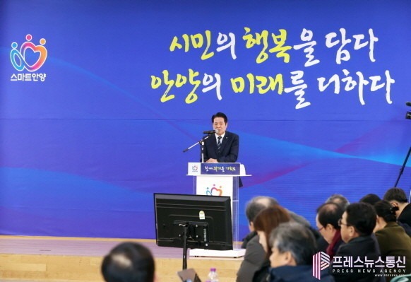 최 시장은 본격적인 올해 시정운영 계획 설명에 앞서 ▲자율주행버스 주야로 운행 ▲기초지자체 유일 유엔 산하 국제전기통신연합(ITU) 스마트도시 국제표준인증 ▲FC안양 K리그1 승격 ▲큰샘어린이도서관・안양그린마루・장애인복합문화관 등 시설 건립 ▲전국 최초로 제안한 경부선 철도 지하화 특별법 제정 등 지난해 성과를 공유했다.