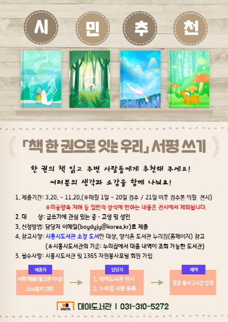 기타 자세한 사항은 시흥시도서관 누리집의 참여마당-도서관 소식 또는 대야도서관(031-310-5272)에 문의하면 된다.