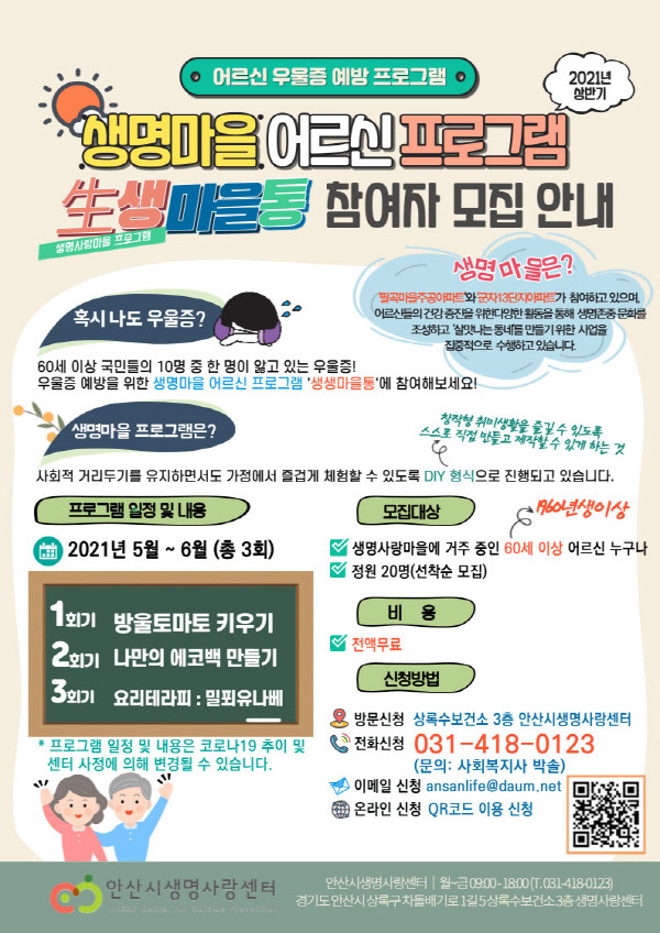 [프레스뉴스] 강보선 기자= 안산시(시장 윤화섭)는 안산시자살예방센터에서 생명사랑마을(선부동 군자주공 13단지·팔곡주공아파트)에 거주하는 60세 이상 노인을 대상으로 6월까지 우울증 예방을 위한 프로그램을 추진한다고 20일 밝혔다.