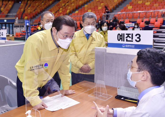 [광주=프레스뉴스] 강래성 기자=이용섭 광주광역시장은 19일 오전 서구 염주종합체육관에 마련된 코로나19 서구예방접종센터를 찾아 이날 진행된 코로나19 지역예방접종센터 모의훈련 과정을 살펴보고 관계자들을 격려했다.