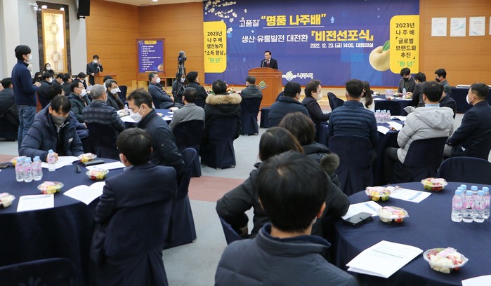 전라남도 나주시(시장 윤병태)는 지난 23일 시청사 대회의실에서 ‘명품 나주배 생산·유통 발전 대전환 비전 선포식’을 개최했다고 26일 밝혔다.