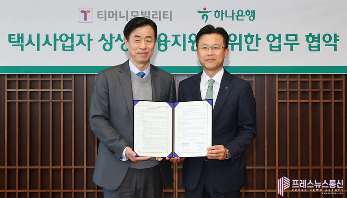 [프레스뉴스] 류현주 기자= 하나은행(은행장 이호성)은 지난 10일 택시사업자의 성장 및 디지털 기반의 모빌리티 금융 프로세스 구축을 위해 티머니모빌리티(대표이사 조동욱)와 『택시사업자 상생 금융지원을 위한 업무협약』을 체결했다고 밝혔다.