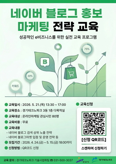 교육 신청은 내달 15일까지 구글폼과 전자우편으로 할 수 있으며, 모집 인원은 선착순 80명이다. 자세한 사항은 안산시청 누리집 공고문을 확인하거나 경기테크노파크(031-500-3037)로 문의하면 안내받을 수 있다.