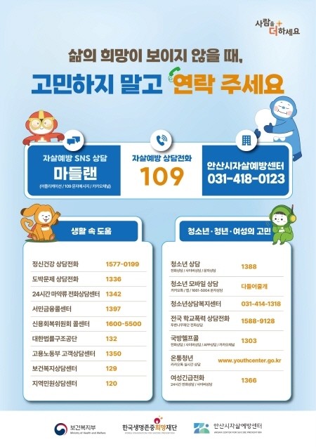 한편, 우울감 등으로 어려움을 겪고 있거나 주변에 도움이 필요한 가족·지인이 있는 경우 안산시자살예방센터(031-418-0123) 또는 자살 예방 상담 전화(109)로 문의하면 상담받을 수 있다.