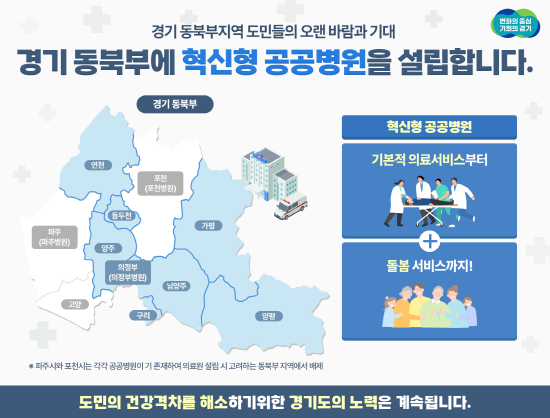 민선 8기 공약사항인 경기 동북부권 공공의료원 설립은 의료 기반 시설이 열악한 동북부 지역에 공공의료 대응체계를 구축해 도내 지역 간 의료 균형발전을 도모하는 사업이다.