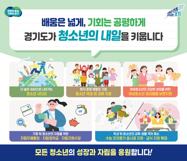 [프레스뉴스] 강보선 기자= 경기도가 청소년의 건강한 성장과 배움 기회, 생활 안정을 위해 급식, 학습·진로·자립 지원까지 아우르는 다양한 정책을 추진한다.