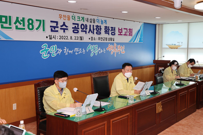 군은 민선8기 ‘무안을 더 크게, 내 삶을 더 높게’ 라는 슬로건 아래 ▲젊은 도시 경제수도 무안 ▲모두 더 잘사는 상생 무안 ▲맛과 멋 힐링 도시 무안 ▲과학영농 선구도시 무안 ▲안전하고 편안한 삶터 무안 ▲교육받기 좋은 도시 무안 ▲화합 소통 행정수도 무안 의 7대 군정 방침에 맞춰 100개 과제를 공약으로 확정했다.