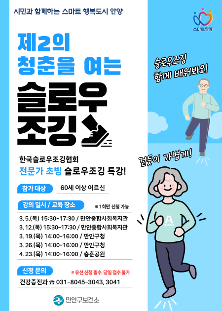 한영자 만안구보건소장은 “어르신들이 안전하게 새로운 운동을 배우고 일상 속 신체활동을 꾸준히 이어갈 수 있도록 이번 클래스를 마련했다”며, “슬로우조깅이 노쇠·근감소증·만성질환 예방에 기여할 것으로 기대하고 있다”고 말했다.