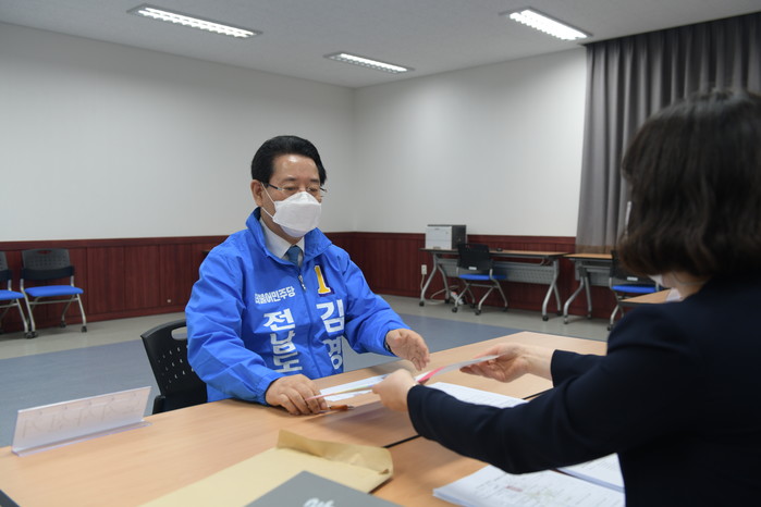 ▲김영록 더불어민주당 전라남도지사 후보가 12일 오전 무안군 삼향읍 전남도선거관리위원회에서 6·1지방선거 전남도지사 후보 등록을 하고 있다./김영록 더불어민주당 전라남도지사 후보측 제공 |