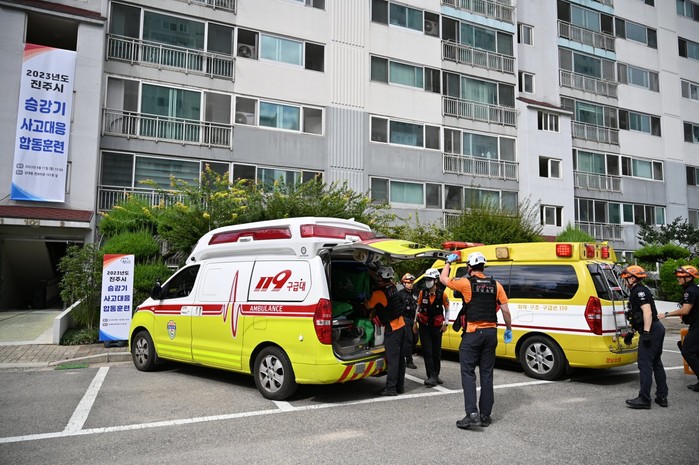 이번 훈련은 진주시와 진주소방서, 승강기유지관리업체가 참여한 가운데 아파트 관리사무소의 협조로 진행되었고, 아파트 관리주체 및 주민 100여 명이 참관했다.