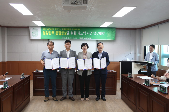 | ▲담양군이 한우농가 경영 개선을 위한 축산연구소 및 축산품질평가원 등 과 업무협약을 체결했다.(사진제공=담양군) |