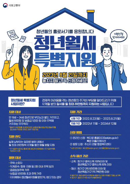 앞서 지난해 8월부터 시행된 청년 월세 한시 특별지원사업은 국토교통부 주관으로 청년들의 주거비 부담 경감을 위해 1년 동안 한시적으로 추진됐다.