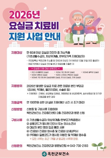 이번 사업은 만 60세 이상 옥천군민 가운데 의료기관에서 요실금 진단을 받은 저소득층을 대상으로 하며, 경제적 부담으로 치료를 미루는 사례를 줄이고 조기 치료를 유도하기 위해 마련됐다.