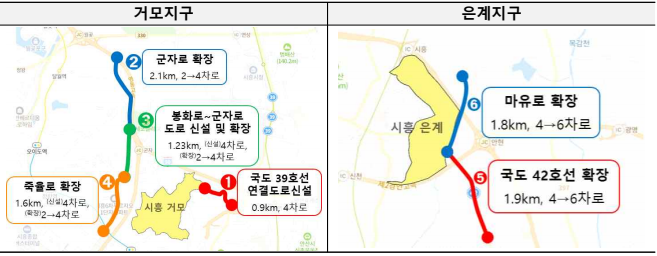 시흥지역 6개 집중투자사업(➊국도 39호선 연결도로 신설, ➋군자로 확장, ➌봉화로~군자로 신설 및 확장, ➍죽율로 확장, ➎국도 42호선 확장, ➏마유로 확장)에 대해 완공 시기를 최대 15개월 단축할 계획이다.