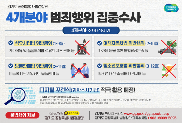 관련 제보는 경기도 특별사법경찰단 누리집, 카카오톡 플러스친구 ‘경기도 공정특별사법경찰단’ 및 경기도 공정특별사법경찰단 과학수사팀, 경기도 콜센터를 통해 가능하다.