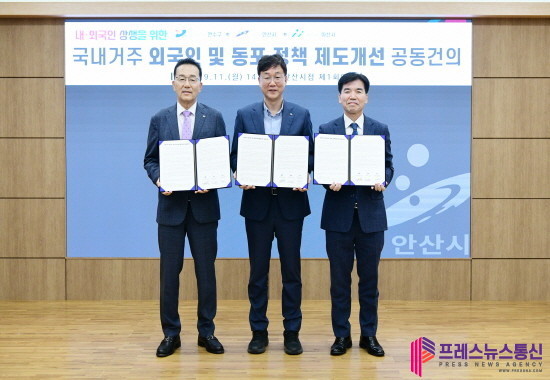 안산시(시장 이민근)는 11일 오후 안산시청 제1회의실에서 인천 연수구(구청장 이재호), 충남 아산시(시장 박경귀)와 함께 ‘국내거주 외국인 및 동포 정책 제도개선’을 위한 공동 건의문 채택 및 서명식을 진행했다고 밝혔다.