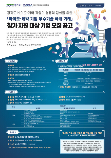 | ▲ 경기도 바이오·제약 기업 우수기술 국내 거래 참가 지원 대상 기업 모집 공고 포스터(사진=경기도) |