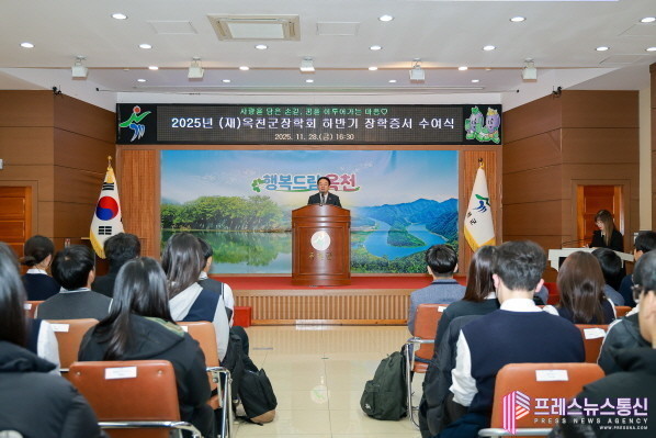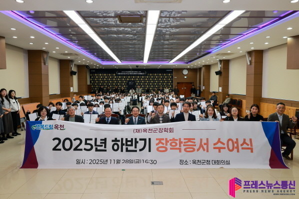 [프레스뉴스] 류현주 기자= (재)옥천군장학회가 지난 28일, 옥천군청 대회의실에서 ‘2025년 하반기 장학생 장학증서 수여식’을 성황리에 개최했다. 이날 행사에는 장학생 및 학부모를 비롯해 (재)옥천군장학회 이사, 관계 공무원 등 120여 명이 참석하여 미래 인재를 격려하고 응원하는 뜻깊은 시간을 가졌다.