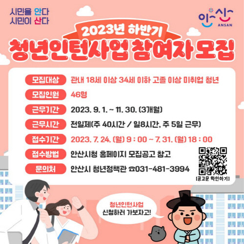 하반기 청년인턴의 응시 자격은 공고일(2023. 7. 21.) 기준 주민등록상 안산시 거주자 중 18세 이상 34세 이하의 미취업 청년이며 모집인원은 총 46명이다.
