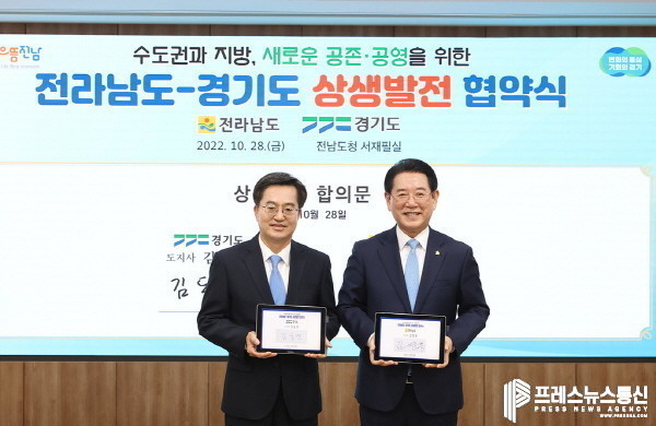 [프레스뉴스] 장현준 기자= 경기도와 전라남도가 도심항공교통(UAM)과 신재생에너지 산업 육성, 지방분권 공동 대응, 우수 농특산물 상생장터 공동 개설 등 양 지역 상생발전을 위한 6개 과제에 합의했다.