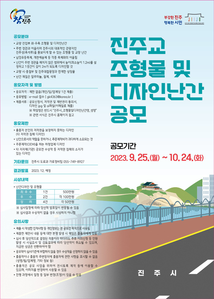 [프레스뉴스] 정호일 기자= 진주시는 1983년도에 준공한 진주교에 특색 있고 새로운 볼거리 제공을 위해 조형물 및 디자인난간 공모전을 진행한다.