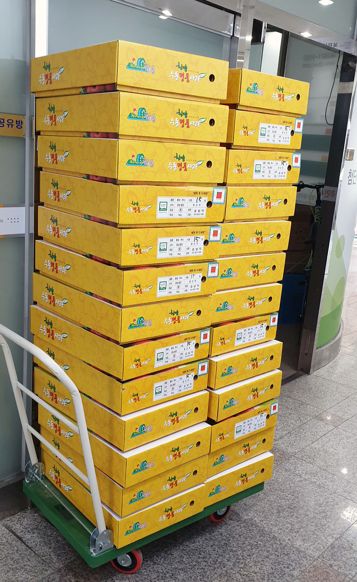 | ▲첨단1동 익명의 기부천사가 놓고 간 사과 상자/광산구청 제공 |
