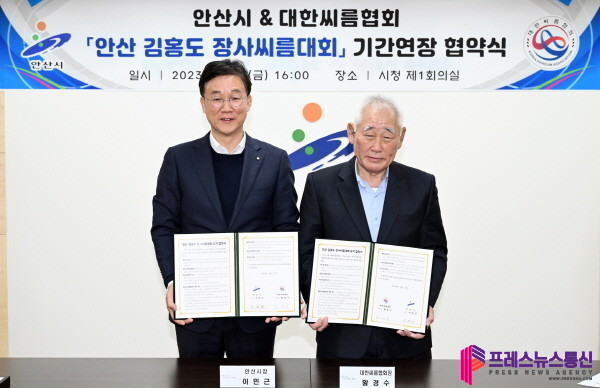 안산시(시장 이민근)는 단원 김홍도 콘텐츠를 더욱 알리기 위해 대한씨름협회(회장 황경수)와 ‘김홍도 장사씨름대회’ 개최 기간 연장을 담은 업무협약을 체결했다고 19일 밝혔다.