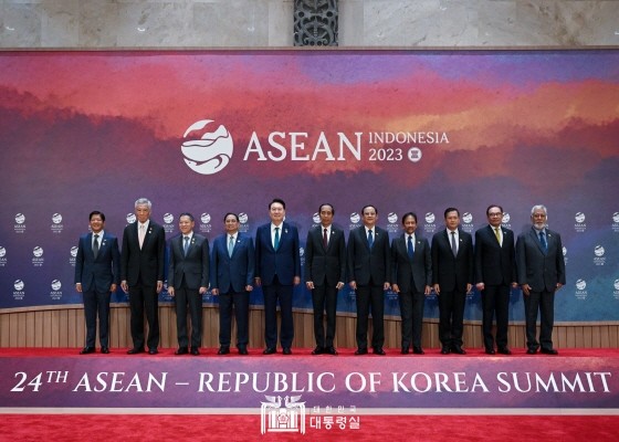 | ▲윤 대통령이 6일(현지시간) 인도네시아 자카르타 컨벤션센터(JCC)에서 열린 아세안+3 정상회의에서 조코 위도도 인도네시아 대통령, 기시다 후미오 일본 총리, 리창 중국 총리 등과 기념촬영을 하고 있다.(사진=대통령실) |