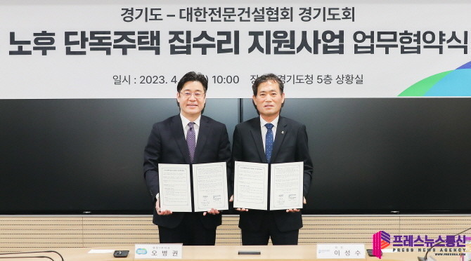 오병권 경기도 행정1부지사는 4일 도청 상황실에서 이성수 대한전문건설협회 경기도회 회장과 ‘노후 단독주택 집수리 지원사업’의 건실한 시공업체 참여를 위한 업무협약을 체결했다.