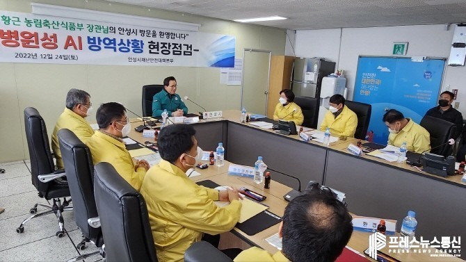 [프레스뉴스] 장현준 기자= 오후석 경기도 행정2부지사와 정황근 농림축산식품부 장관이 지난 24일 안성시 일죽면에 소재한 거점소독시설과 안성시청 방역대책상황실을 방문해 고병원성 조류인플루엔자(AI) 방역 상황을 긴급 점검했다.