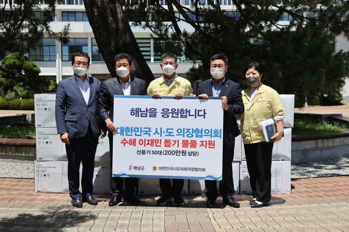 [전남=프레스뉴스] 강래성 기자= 전라남도의회 김성일‧조광영 의원은 지난 19일 해남군청을 찾아 대한민국시도의장협의회에서 지원한 200만원 상당의 선풍기 50대를 전달했다.