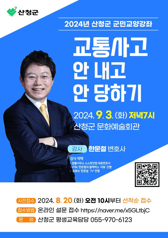 강연은 산청군민 누구나 참여할 수 있으며 네이버 설문(https://naver.me/x5GLtbjC)을 통해 사전 신청(20일 오전 10시부터 선착순 접수) 후 입장 가능하다.