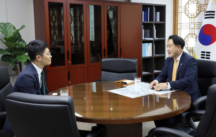 [프레스뉴스] 김교연 기자=세종시의회 상병헌 의장이 지난 31일 집무실에서 권동철 세종세무서장과 만나 환담을 나눴다.
