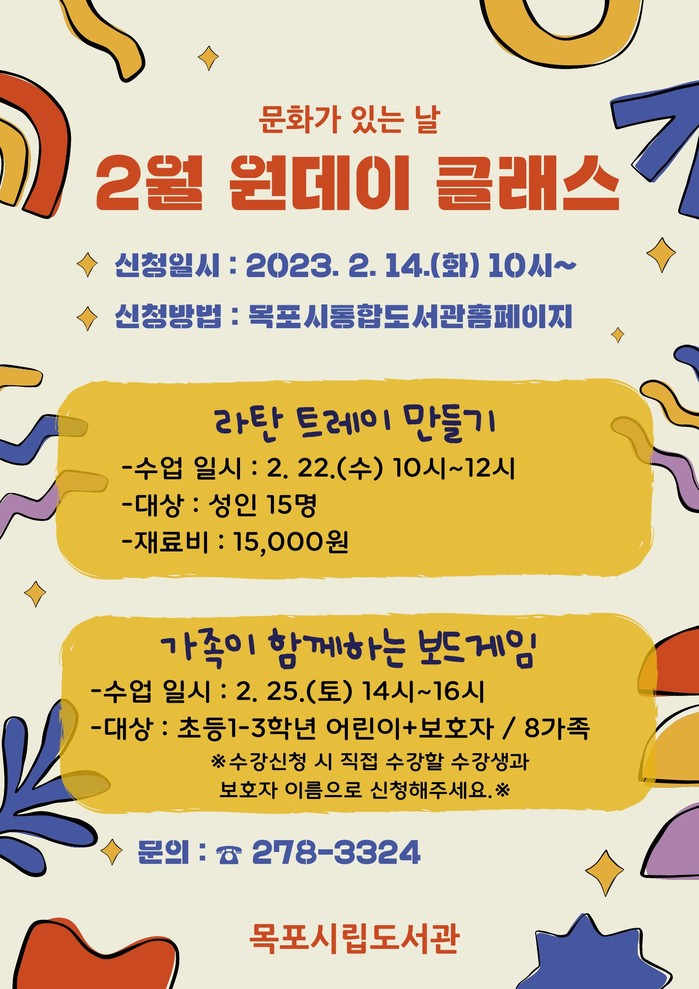 [전남=프레스뉴스] 이광남 기자= 전남 목포시립도서관이 2월 문화가 있는 날을 맞아 ‘원데이 클래스’를 운영한다.