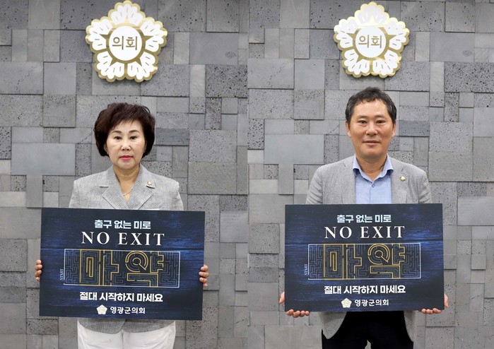 [전남=프레스뉴스] 강래성 기자= 영광군의회 자치행정위원장 정선우 의원과 산업건설위원장 조일영 의원은 8월 7일, 최근 사회문제로 대두되고 있는 마약 범죄 근절을 위해 ‘NO EXIT’ 캠페인에 동참했다.