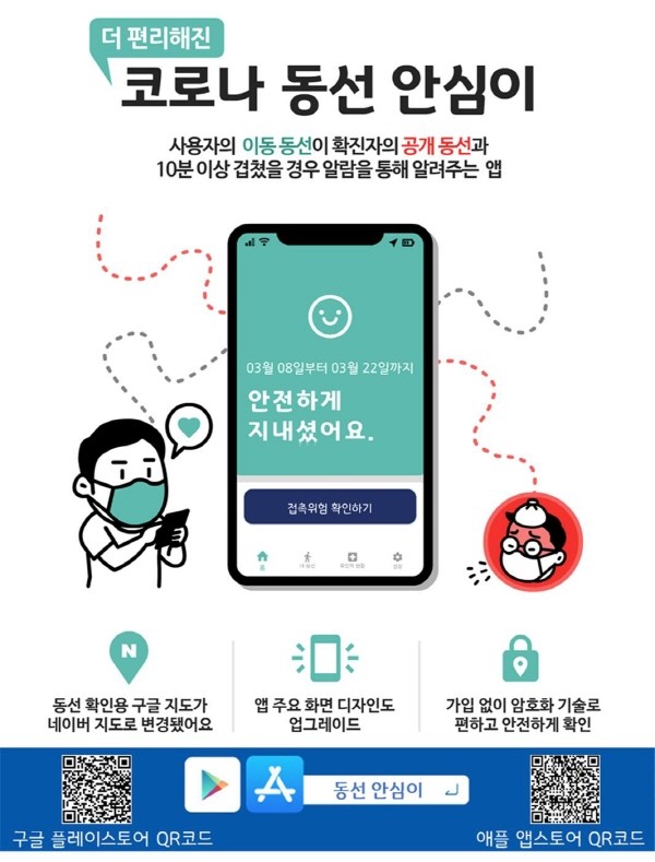 경기도는 지난 2월 23일 서울대와 협력해 ‘코로나 동선 안심이’ 앱서비스를 정식 시작한 후 사용자들이 요구한 사항을 반영해 동선 확인 지도를 구글 지도에서 네이버 지도로 바꾸고 주요 디자인을 변경하는 등 업그레이드를 통해 사용자의 편의성을 높였다.