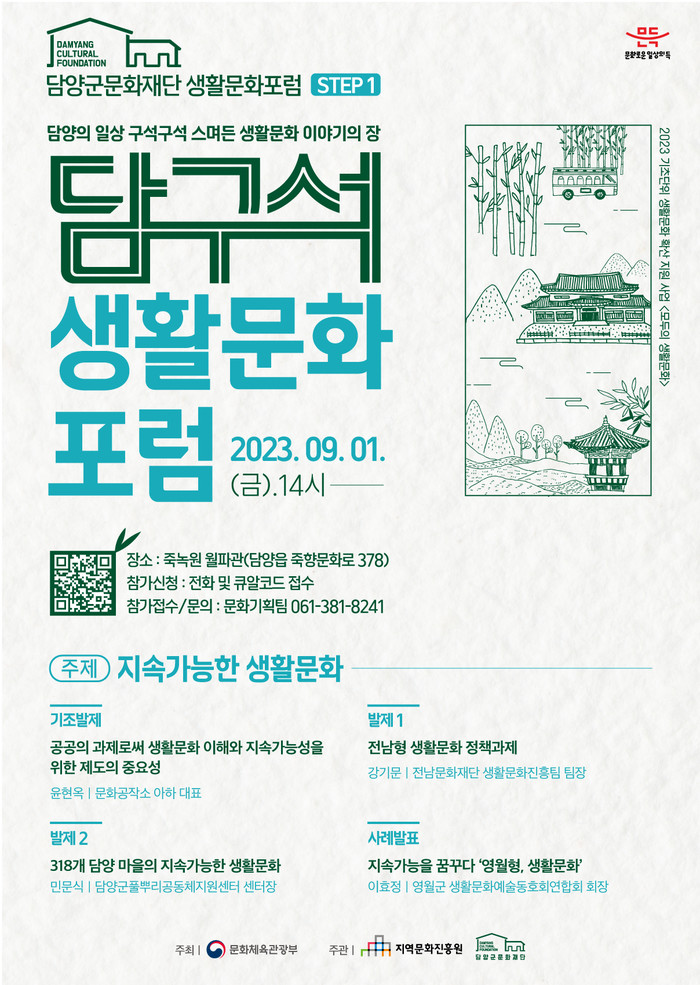 이번 생활문화포럼은 공공의 제도 및 역할과 민간 공동체의 성공사례를 공유하고 담양지역 생활문화의 지속가능성과 발전방향에 대해 논의하는 장이 될 예정이다.