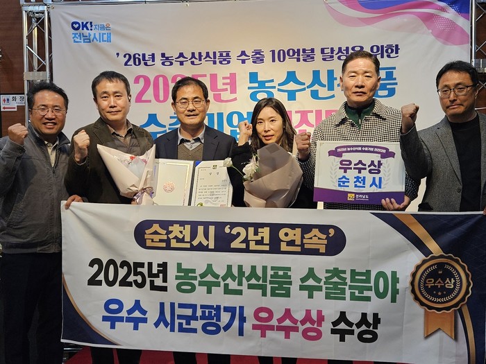 [전남=프레스뉴스] 강래성 기자= 순천시는 지난달 28일 남악스카이컨벤션센터에서 열린 2025년 농수산식품 수출분야 우수 시군 평가에서 작년에 이어 우수상을 2년 연속 수상했다.
