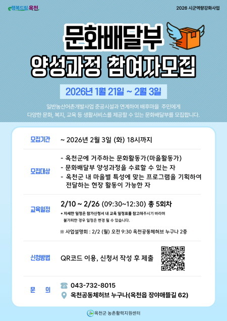 [프레스뉴스] 류현주 기자= 옥천군이 2026년 시군역량강화사업의 일환으로 ‘2026 문화배달부 양성과정’ 교육 참여자를 모집한다고 밝혔다.