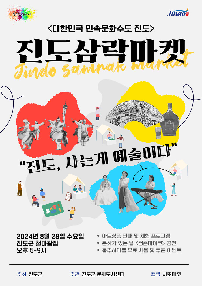 [전남=프레스뉴스] 신상균 기자= 전남 진도군은 8월부터 10월까지 매월 마지막 주 수요일 ‘문화가 있는 날-청춘마이크’ 전라·제주권 공연 개최에 발맞춰 ‘진도삼락마켓’을 진도읍 철마광장 일원에서 동시에 개최한다.