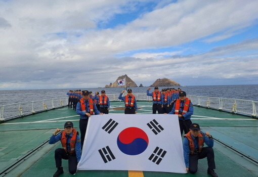 | ▲동해해양경찰서 3007함 경찰관들이 지난 2월 8일 독도를 앞에 두고 해양 주권 수호를 다짐하고 있다.(사진= 동해해경) |