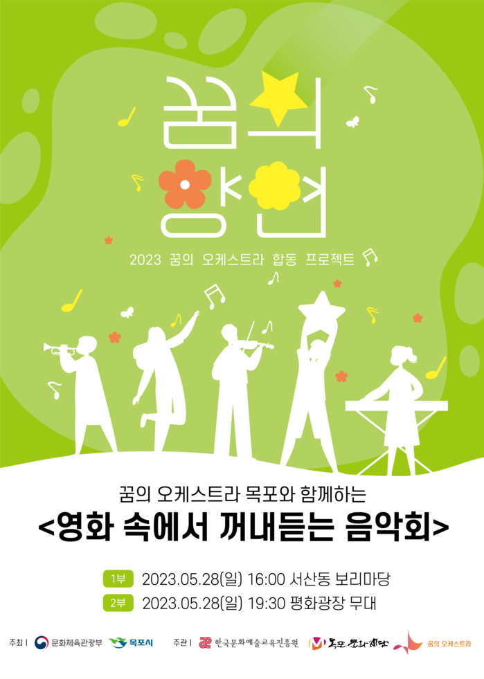 꿈의 오케스트라 목포가 펼칠 ‘영화 속에서 꺼내 듣는 음악회’ 공연은 서산동 보리마당에서 오후 4시에 1부가 진행되며 2부는 평화광장 무대에서 오후 7시 30분에 진행된다.