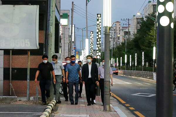 ▲ 지난 9일 맹정호 서산시장이 먹거리골 경관조명 설치현장을 점검하고 있다( 사진제공= 서산시) |
