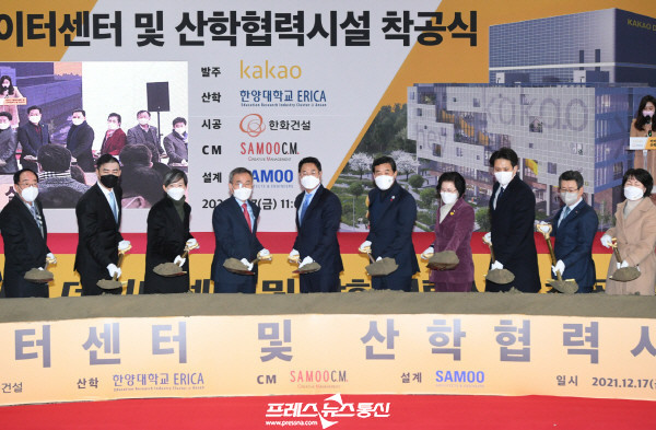 시는 이날 한양대 ERICA캠퍼스 혁신파크에서 윤화섭 시장과 여민수 카카오 대표이사, 김우승 한양대 총장 등 관계자가 참석한 가운데 카카오 데이터센터 및 산학협력시설 착공식을 개최했다.