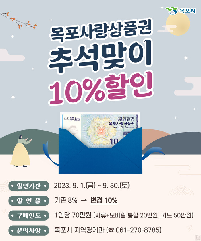 [전남=프레스뉴스] 이광남 기자= 전남 목포시가 추석 명절을 맞아 오는 9월 1일부터 30일까지 한달간 목포사랑상품권 할인율을 8%에서 10%로 상향해 판매한다.