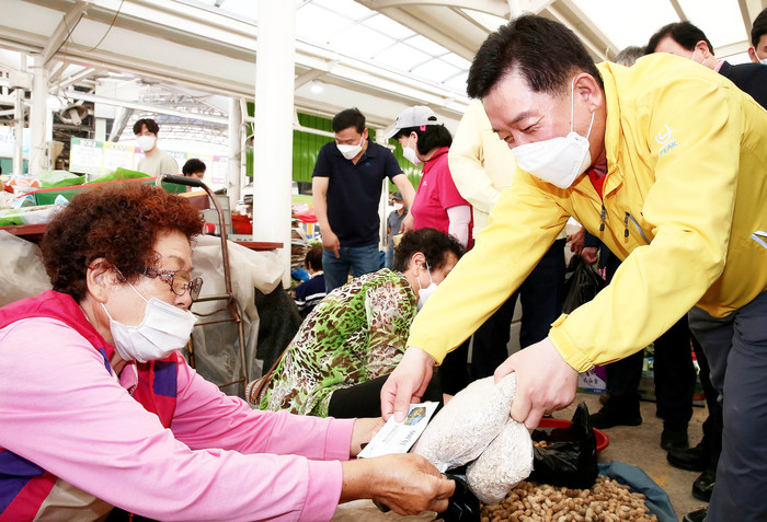 ▲ 지난 18일 구충곤 화순군수(사진 오른쪽)가 화순읍 고인돌전통시장을 방문, 화순사랑상품권으로 장을 보는 모습. (사진제공=화군순) |