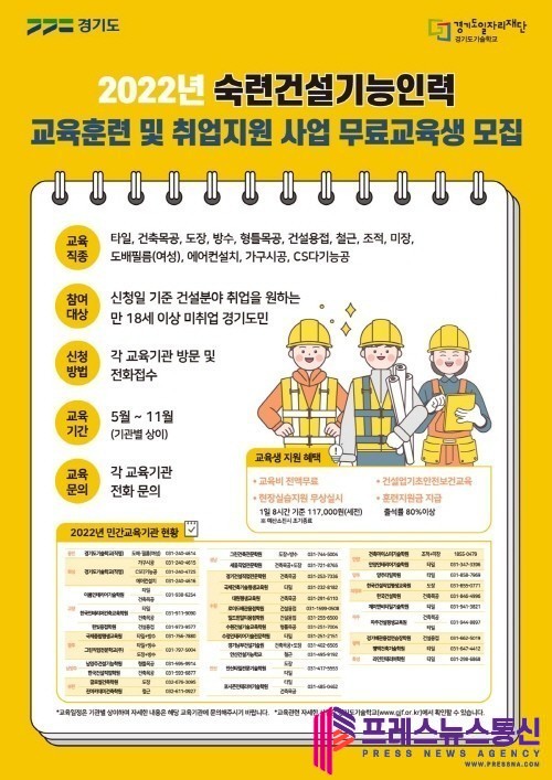 [프레스뉴스] 장현준 기자= 경기도일자리재단이 2022년도 건설분야 교육생 1,800명을 모집해 도내 32개 교육기관을 통해 현장 맞춤형 건설기능인력 양성에 앞장선다.