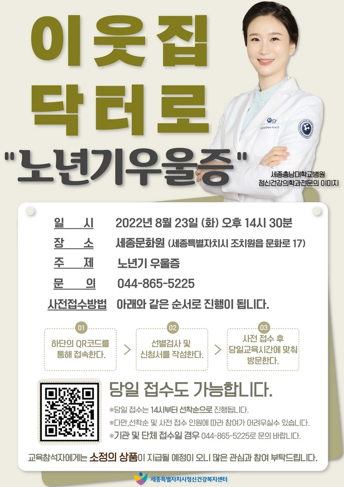 이번 강좌는 세종정신건강복지센터 센터장이자 세종충남대학교병원 정신건강학과 전문의인 이미지 교수가 강사로 나서 ‘노년기 우울증’을 주제로 진행할 예정이다.