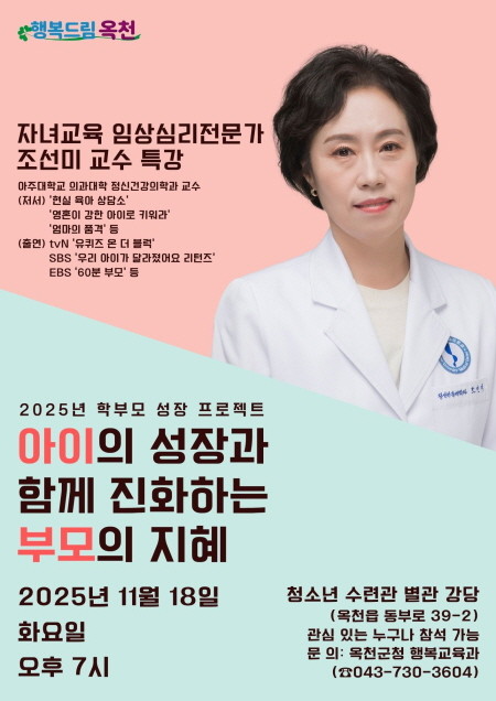 [프레스뉴스] 류현주 기자= 옥천군은 학부모 성장 프로젝트의 일환으로 18일 19시 청소년수련관 별관 강당에서 아주대학교 의과대학 정신건강의학교실 조선미 교수를 초청해 부모 교육 명사 특강을 개최했다.